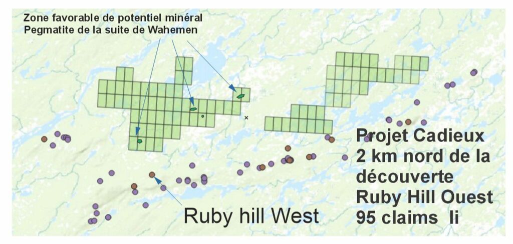 Cadieux can be considered a Lithium "grass roots" project. Its proximity to the Ruby hill Lithium and Gold discovery and potential Lithium mineral zones as defined by the Ministère des Ressources naturelles et des Forêts. Our original property has been extended to the east to reach a 95 claim block. This is a very active region and we believe there is a decent potential in this property.